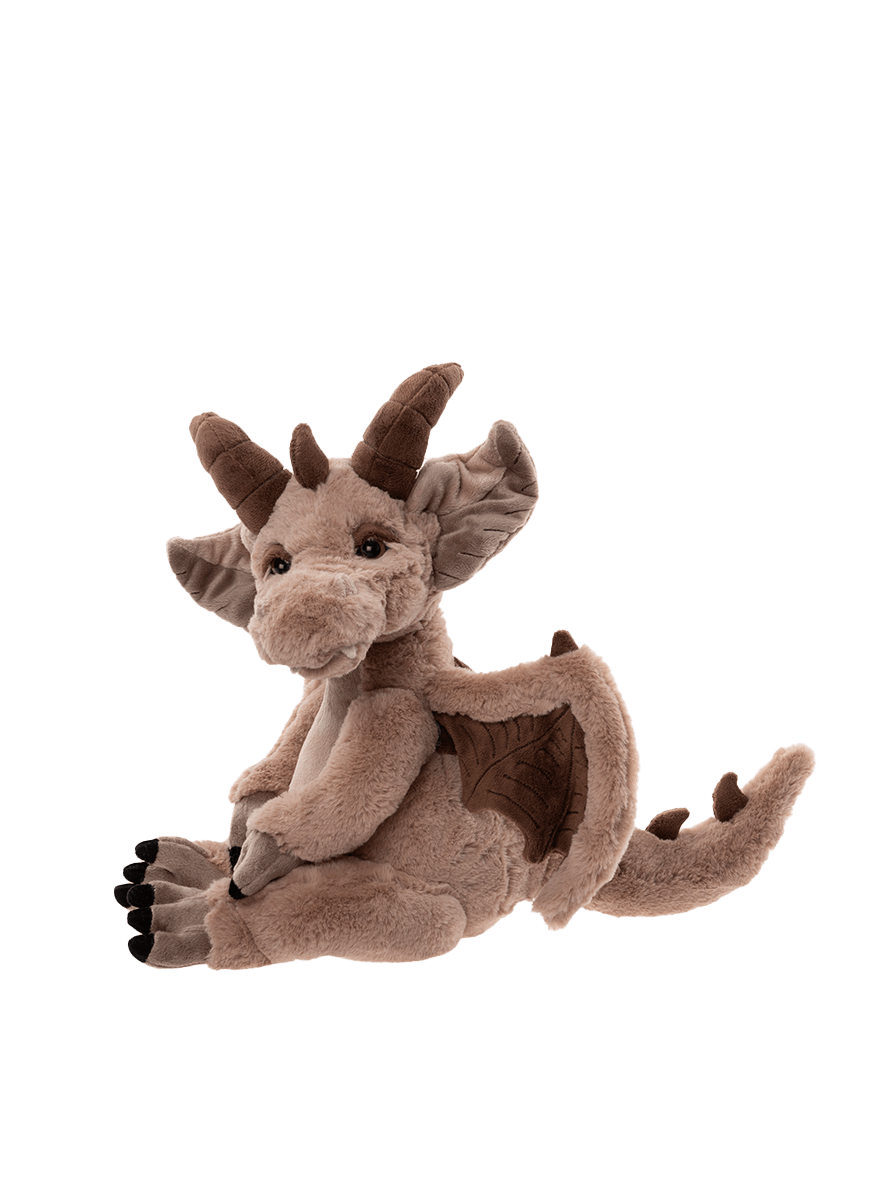 Meet Feldspar, a stunning addition to our Signature Collection, inspired by the whimsical illustrations of Ali Montgomery. This captivating gargoyle is crafted from ultra-soft almond plush with intricately detailed chocolate-brown wings and horns, creating a bold and magical presence. Feldspar not only has two semi-curved horns atop his head, but lots of smaller horns trailing down his back and tail. His large, expressive ears add even more character and charm to his mythical look. Feldspar is part of a magical group of Signature Collection companions, alongside Eglin, Zen Zhu, and Mirren. Together, these mythical friends bring wonder, charm, and a touch of fantasy to any collection. Suitable for ages 14 years+. Limited edition of only 2000 pieces globally. Gargoyle height: 43cm/17”/14.3 Bear Paws.