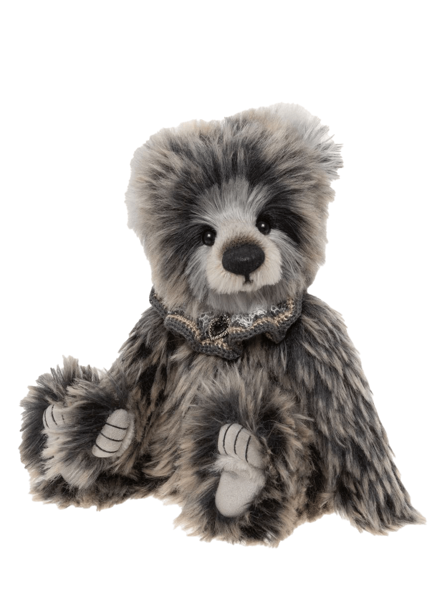 Pebbleshire is a distinguished panda from the 2026 Isabelle Collection, with a thoughtful expression and a wonderfully gentle presence. Crafted from luxuriously soft, wavy mohair with alpaca detailing in a striking blend of smoky charcoal, soft stone-grey and beige tones, he has a beautifully classic panda appearance. His contrasting facial markings and bespoke paws give him depth of character, while his delicately detailed collar and decorative heart pendant add an elegant finishing touch.