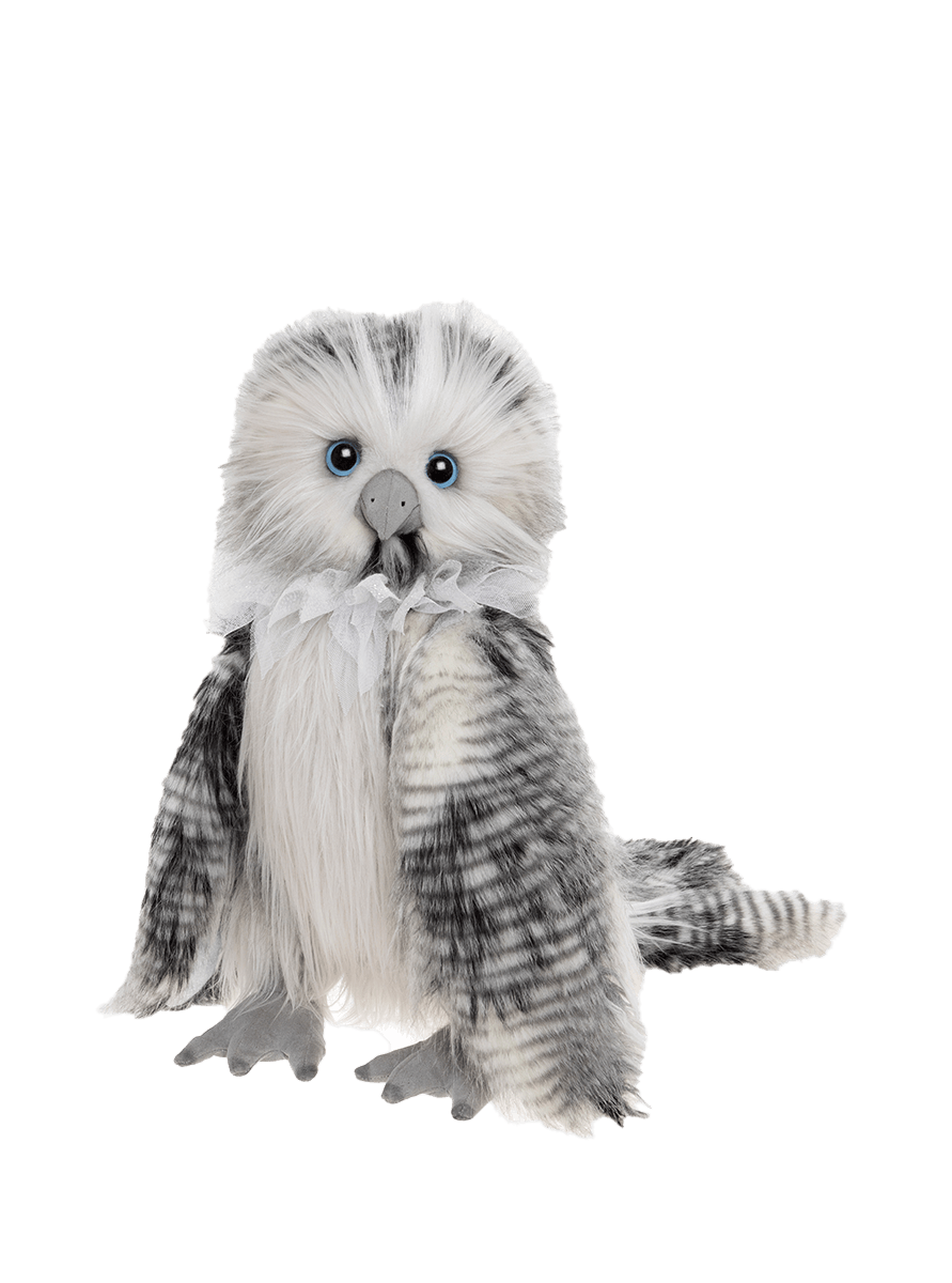 Tuto is an exquisite plush owl from the Charlie Bears Julien Macdonald Signature Collection. This regal, standing character is expertly crafted to capture your heart. Made from sumptuously soft grey, white and black long-pile plush which is expertly designed to mimic the soft beauty of real plumage. Her gorgeous sparkling wings add a magical shimmer, while the hand-embroidered nose detail showcases the artistry behind each piece. To complete her sophisticated look, Tuto wears an elegant lace collar, adding a touch of glamour and refinement. Limited to just 1,200 pieces worldwide, each Tuto is individually numbered, making her a truly exclusive treasure for collectors. Suitable for ages 14 years+. Owl height: 38cm/15"/13 Bear Paws.